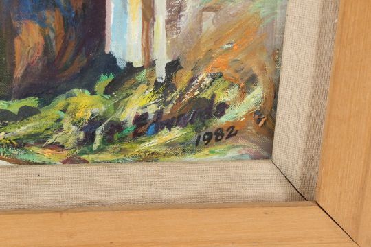 JOHN R EDWARDS 'Grassington, York' oil on canvas signed, inscribed and dated '82 inscribed on stretcher bar 40.5 x 76cm