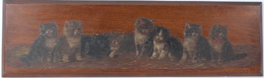 BESSIE BAMBER Line of eight kittens on straw oil on wooden panel signed with initials 31 x 103cm