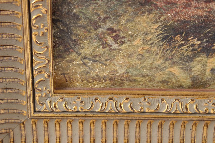 THOMAS CRESWICK Woodland stream with fishermen oil on board signed 29 x 39cm