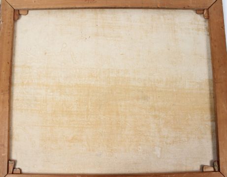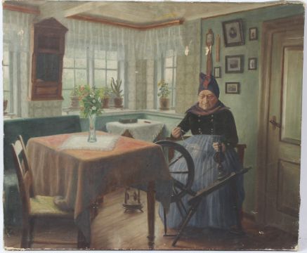 EUROPEAN SCHOOL (EARLY 20TH CENTURY) Interior scene of a seated woman at a spinning wheel oil on canvas signed indistinctly and dated 1918 unframed 63 x 75.5cm
