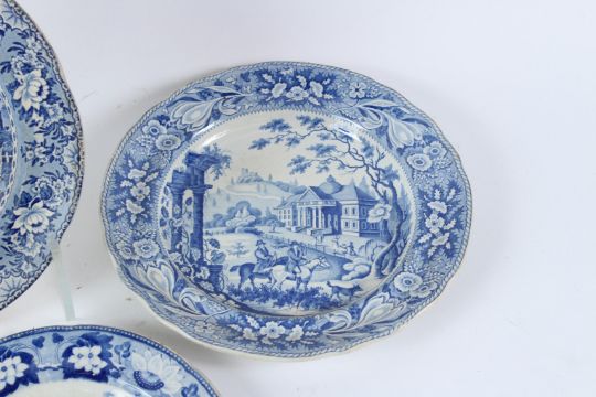 SIX 19TH CENTURY TRANSFER PRINTED BLUE AND WHITE PLATES each depicting rural landscapes and buildings.