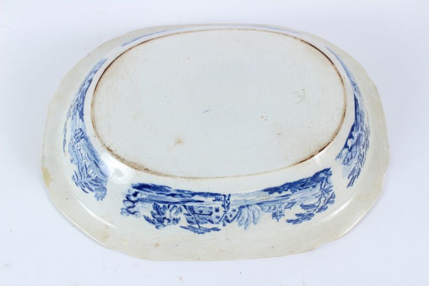 A 19TH CENTURY DAVENPORT TRANSFER PRINTED BLUE AND WHITE RECTANGULAR DISH, decorated with a rural landscape, cattle and a cottage; together with a Davenport fan shaped dish and cover, and a warming dish.