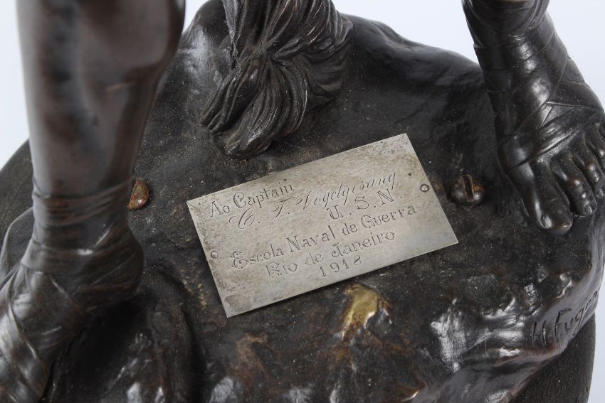 A LATE 19TH CENTURY BRONZE FIGURE OF A MAN DRAWING HIS SWORD FROM ITS SCABBARD, signed to the base, on a wooden stand, and later presentation plaque.