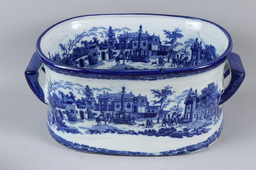 TWO REPRODUCTION BLUE AND WHITE PORCELAIN FOOTBATHS.