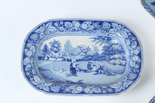 A 19TH CENTURY TRANSFER PRINTED BLUE AND WHITE RECTANGULAR DISH, depicting Nuneham Court, Oxfordshire; together with three further rectangular dishes with scenes of London Bridge and figures in landscape scenes.
