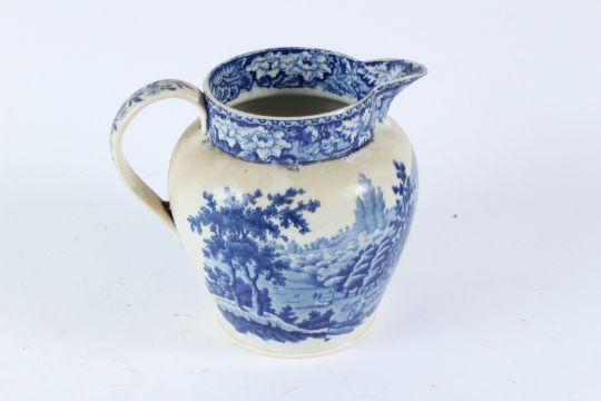 THREE 19TH CENTURY TRANSFER PRINTED BLUE AND WHITE JUGS, decorated with hunting scenes and river landscapes.