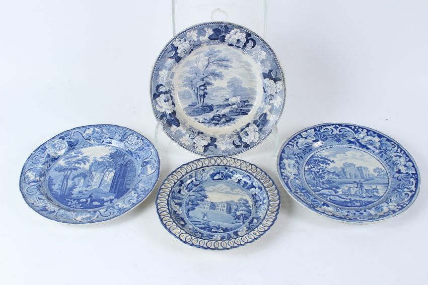 FOUR 19TH CENTURY TRANSFER PRINTED BLUE AND WHITE PLATES, each with a named view: Roche Abbey, Yorkshire, Netley Abbey, Tedesley Hall and Amport House, Hampshire.