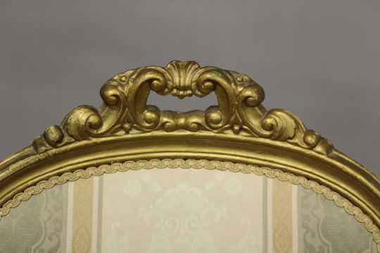 A FRENCH STYLE GILT FRAMED FAUTEUIL, with carved wood frame, classical style upholstery, on curving legs.