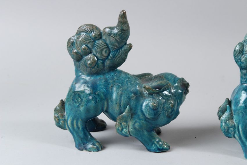 A PAIR OF 20TH CENTURY CHINESE POTTERY LION DOGS with turquoise glazed decoration.