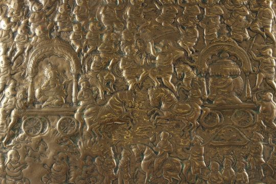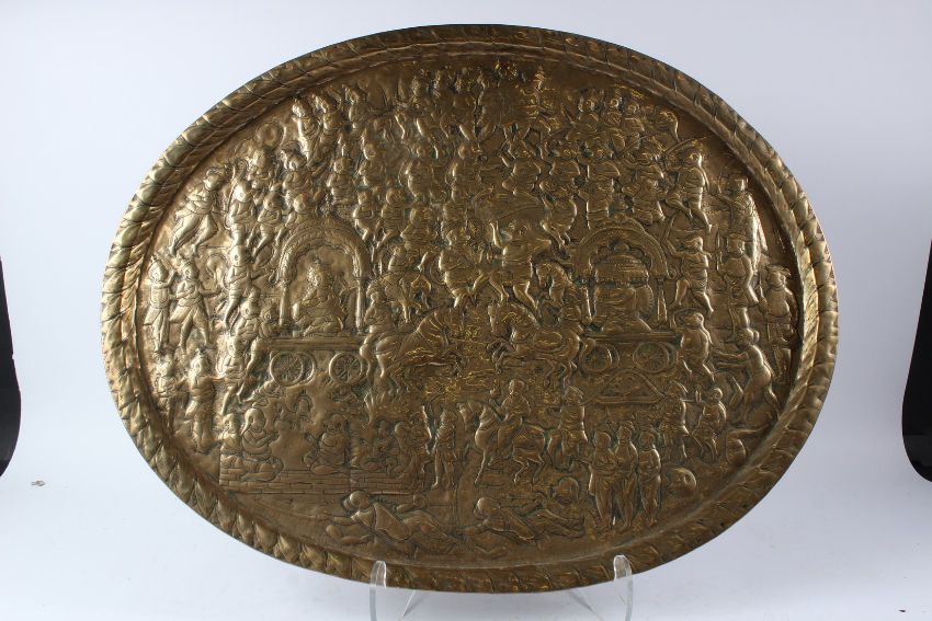 A VERY LARGE 19TH CENTURY INDIAN BRASS TRAY depicting a scene from the Ramayana.