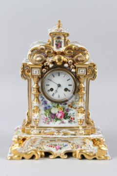 A MID 19TH CENTURY FRENCH PORCELAIN MANTLE CLOCK with floral painted and gilded case, the white enamel dial signed J. Silvani, Paris.