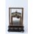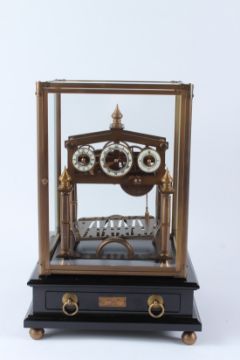 A REPRODUCTION BRASS CONGREVE ROLLING BALL CLOCK, in a glass case with mahogany stand.