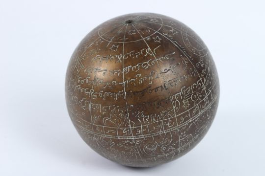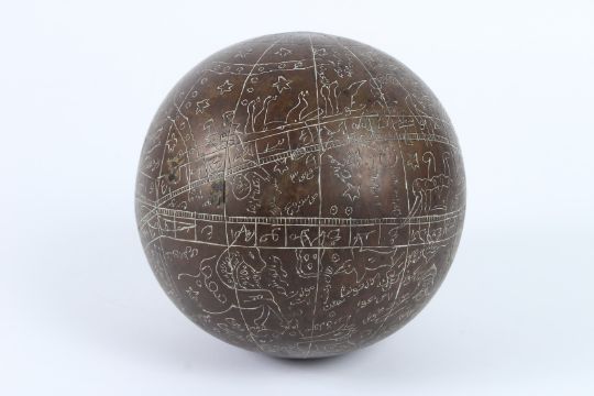 A 19TH - 20TH CENTURY INDIAN ENGRAVED BRASS CELESTIAL GLOBE.