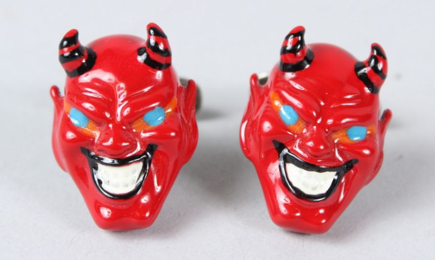 A PAIR OF STERLING SILVER RED DEVIL MASK ENAMEL CUFFLINKS.