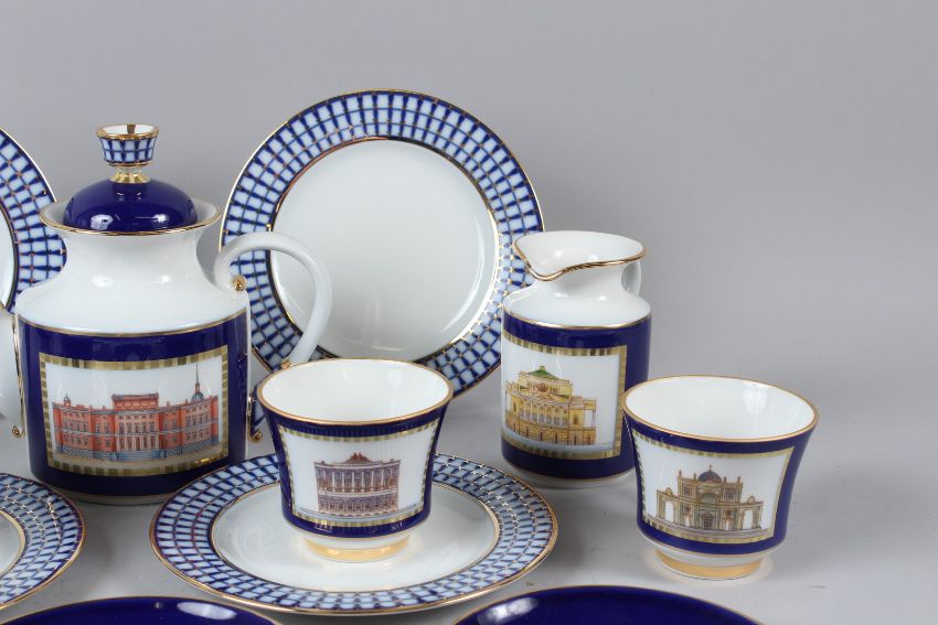 A RUSSIAN "IMPERIAL PORCELAIN" TEA SERVICE, comprising teapot, milk jug, sugar bowl, four cups and saucers, four plates, each decorated with historic Russian buildings.