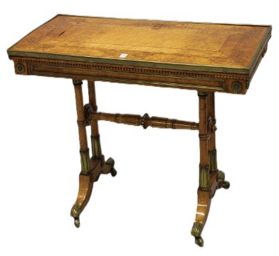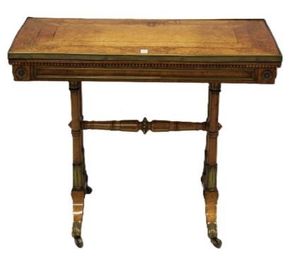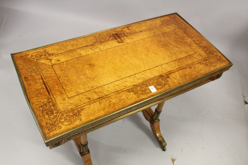 AN EARLY 19TH CENTURY MAPLE RECTANGULAR CARD TABLE, with foldover swivel top having an ormolu edge, ormolu mounts to the frieze, supported on a pair of twin columns, a turned stretcher, on four outswept legs.