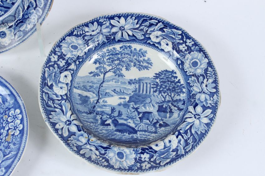 A 19TH CENTURY RIDGEWAY TRANSFER PRINTED BLUE AND WHITE PLATE "Blind Boy"; together with a further Ridgeway plate depicting fisherman and two other bowls depicting a pavilion and deer and a pastoral scene.