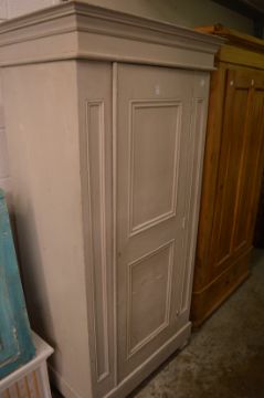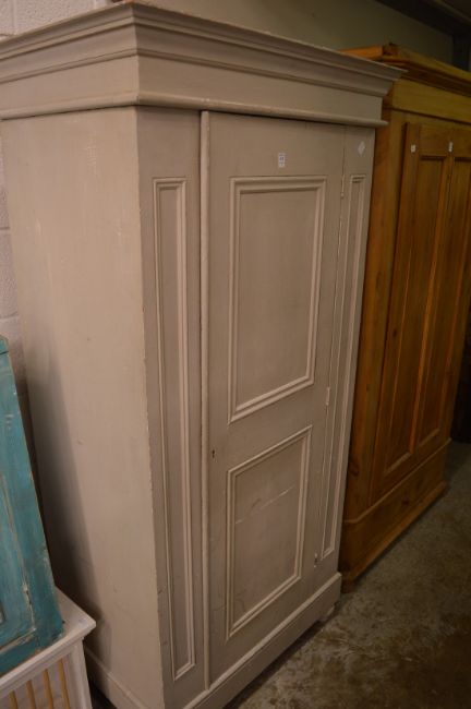 A grey painted pine single door cupboard.