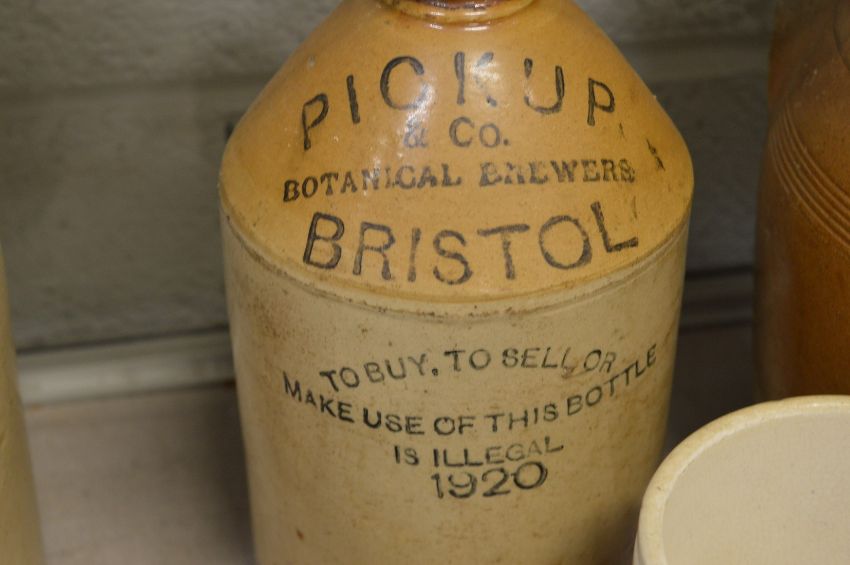Two stoneware jars, labelled E G Palliser, Exeter Brewery and Railway Brewery, Bath and similar items.