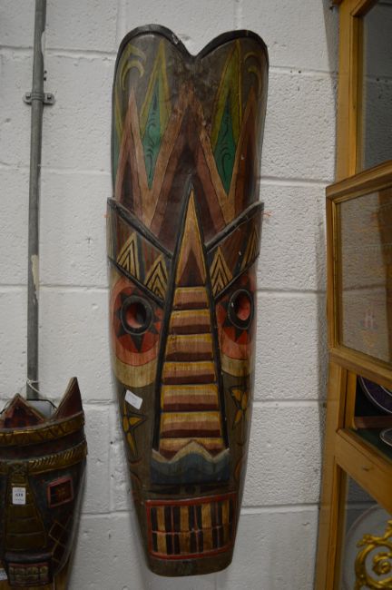 A large colourful painted wooden mask and another similar smaller one.