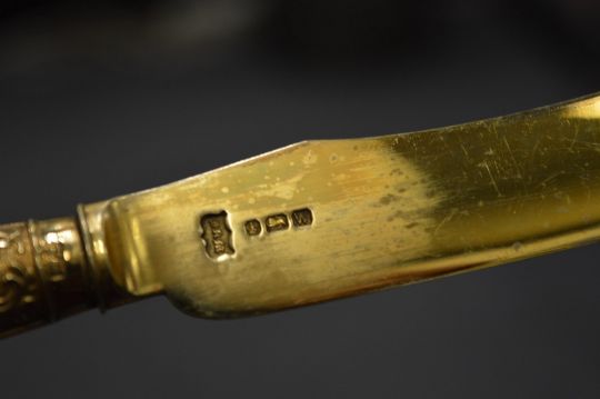 Mappin and Webb, a good cased set of twelve silver gilt dessert knives and forks.