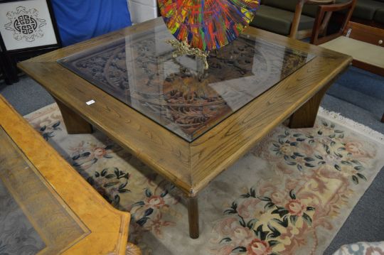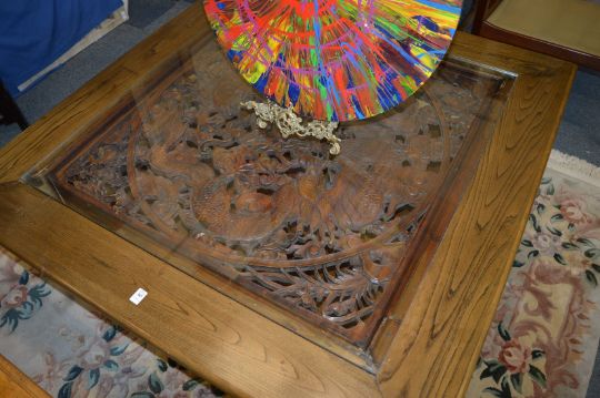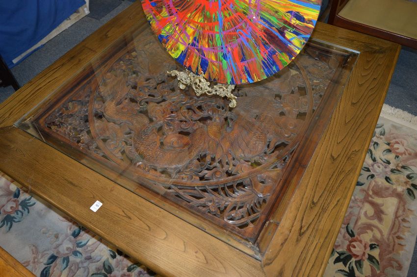 A large square shaped Chinese elm coffee table, the central panel carved with dragons.
