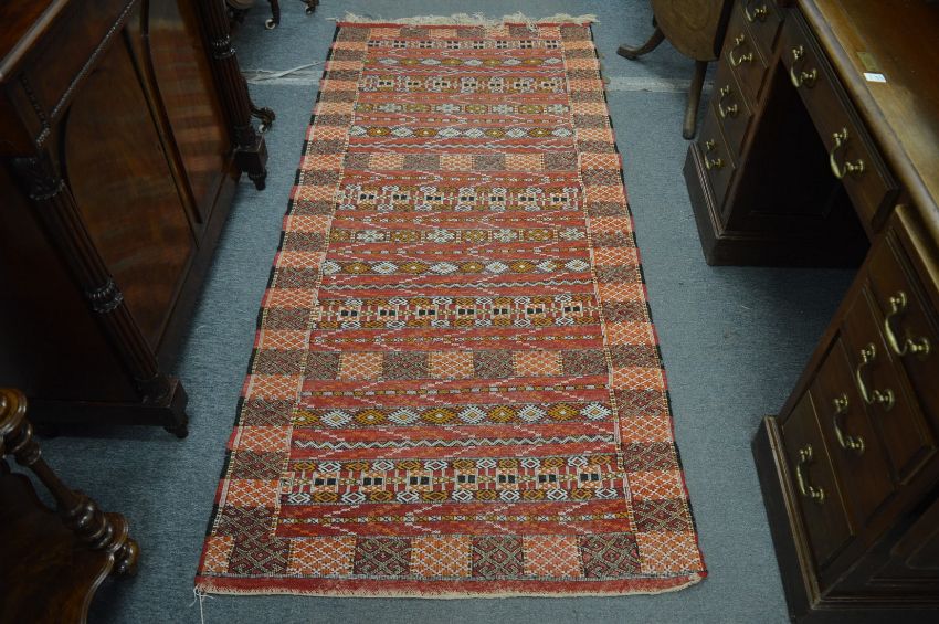 An Eastern rug, red ground with geometric decoration, 211cm x 95cm.
