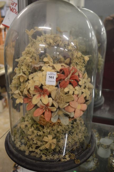 An unusual Victorian wool work sculpture of flowers under a glass dome (dome damaged).