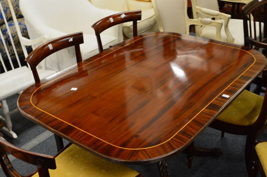 A Regency mahogany tilt-top breakfast table of rounded rectangular form on a turned column with four splay legs and brass castors.