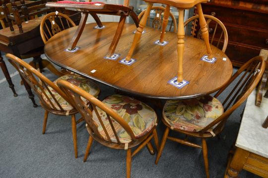 An Ercol drop-leaf pedestal dining table together with a set of six Ercol Prince of Wales splat-back dining chairs.
