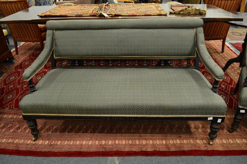 A Victorian ebonised and parcel gilded three piece suite comprising, settee and pair of armchairs with upholstered backs, arms and seats on turned and fluted supports with brass castors.