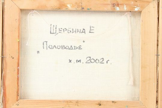 E CHERBINA (RUSSIAN 20TH CENTURY) Lake view with trees and house oil on canvas signed, inscribed and dated 2002 verso 25.5 x 32.5cm