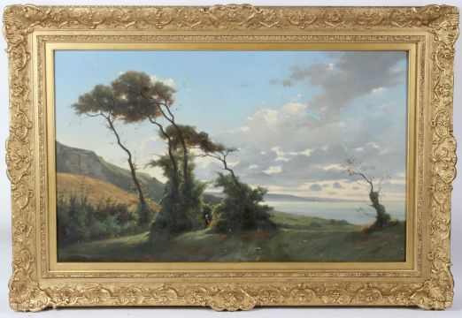 ERNEST J DUMAX (1811-1900) Coastal landscape with figure standing amongst trees oil on canvas signed 52 x 86cm