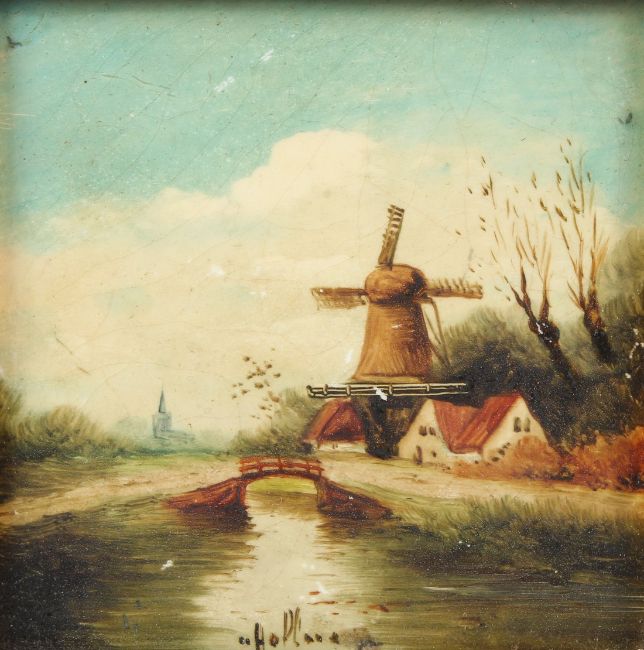 DUTCH SCHOOL Canal view with windmill painted ceramic tile inscribed 'Holland' 11.5 x 11.5cm