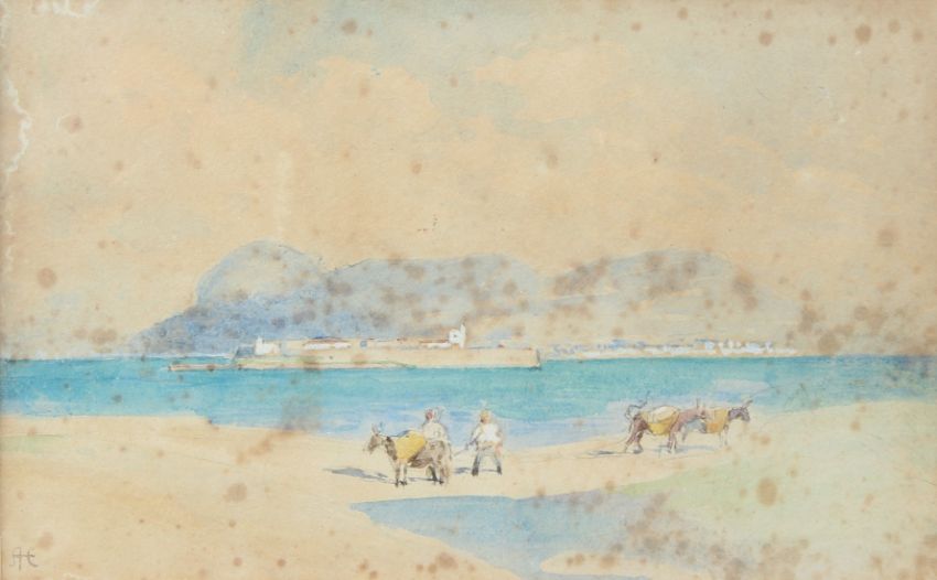 ALFRED EAST Coastal scene with figures and donkeys on a sandy shore probably Gibraltar from Algeciras watercolour signed with initials (a/f) 14.5 x 23.5cm