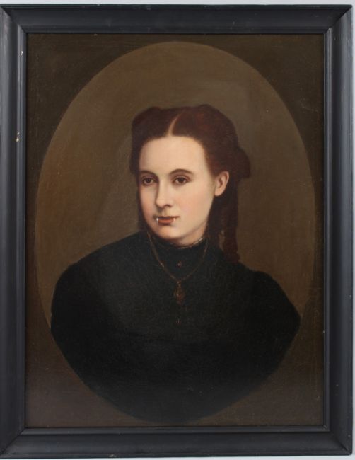 19TH CENTURY STYLE Gothic style portrait of a woman with vampire like teeth oil on canvas oval 58 x 44cm