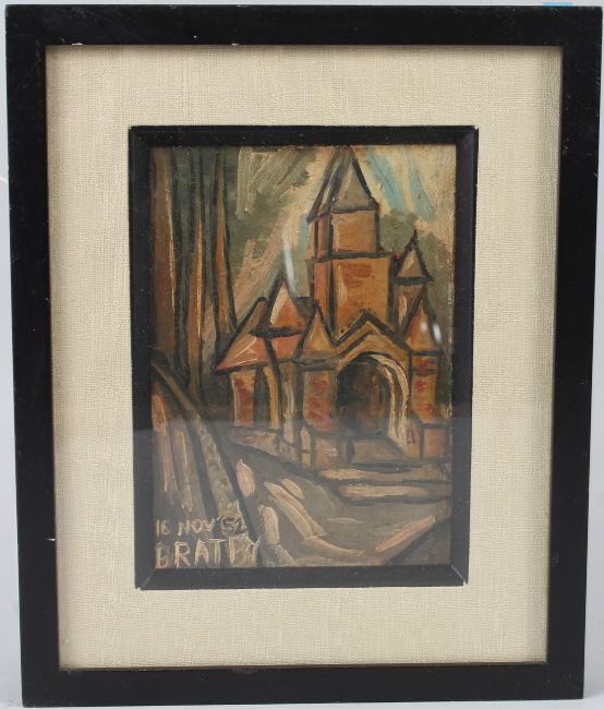 ATTRIBUTED TO JOHN BRATBY 'Church Lane' oil on canvas mounted on board signed and dated 16 Nov '52 with certificate 17 x 12cm