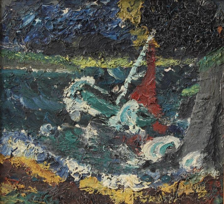 MODERN BRITISH SCHOOL Figure and small boat in a storm oil on board 55 x 46cm