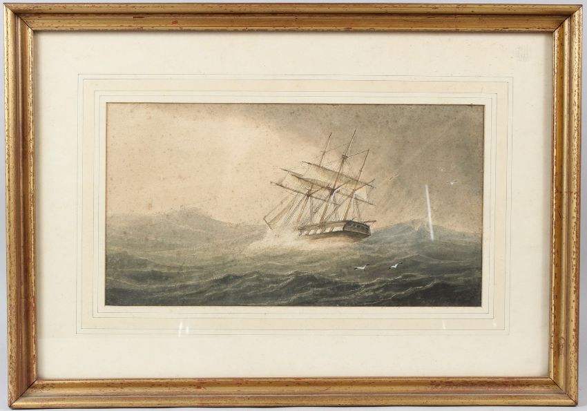 MARITIME SCHOOL (20TH CENTURY) Three mast sailing ship in rough seas watercolour 19 x 35cm
