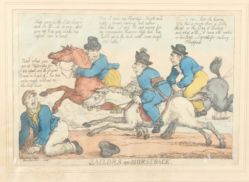 THOMAS ROWLANDSON Regency period caricature 'Sailors on Horseback' 24 x 35cm (a/f)