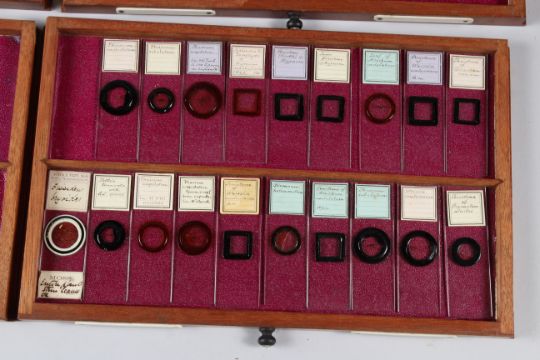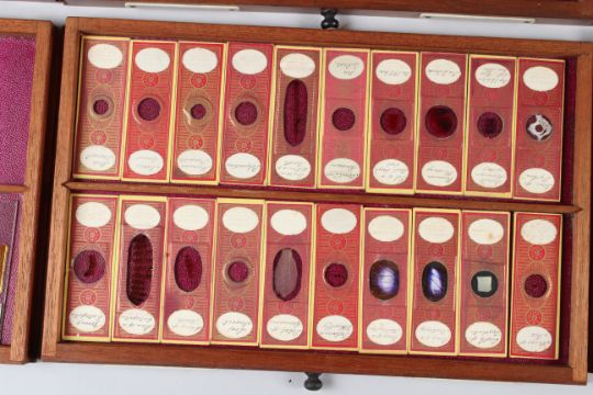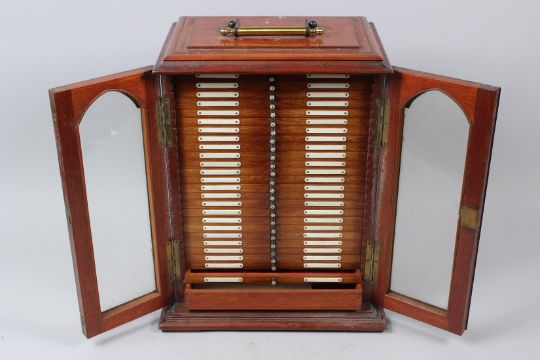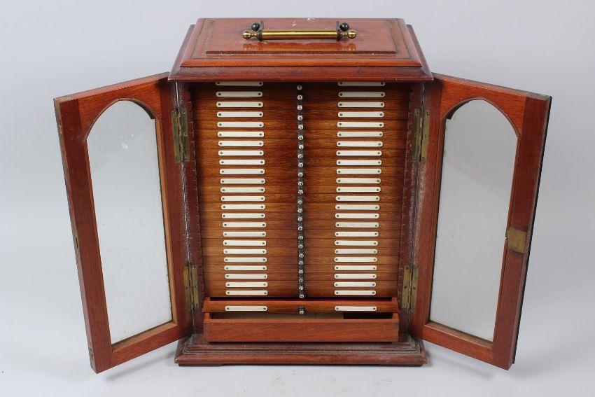 A GOOD 19TH CENTURY MAHOGANY TWO-DOOR TABLE TOP CABINET, containing 25 numbered drawers of microscope slides.