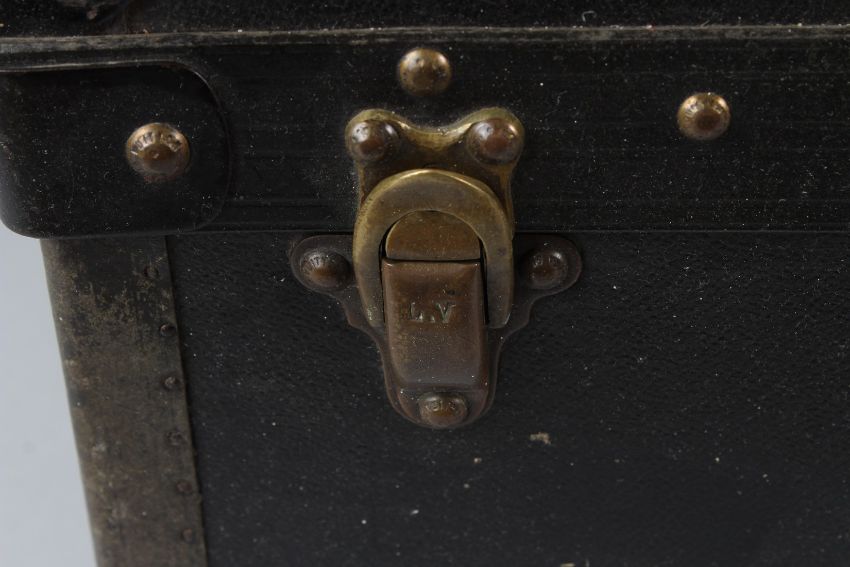 LOUIS VUITTON, A LARGE SUITCASE WITH BLACK LEATHERCLOTH COVERING, brass locks and black japanned mounts, lift-out interior tray, labelled LOUIS VUITTON, PARIS, 70 CHAMPS ELYSEES, No. V8406Z.