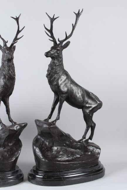 A LARGE PAIR OF BRONZE STAGS ON MARBLE BASES.