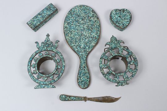 A COLLECTION OF SIX TURQUOISE INLAID PERSIAN METAL ITEMS IN TWO CLOCK CASES, mirror, boxes, etc.