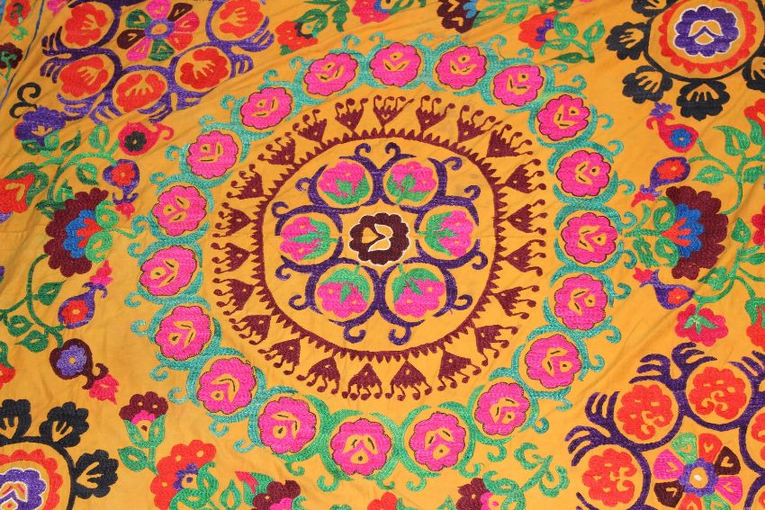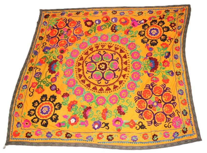 AN UZBEK SUZANI TEXTILE, orange ground with a floral embroidered design.