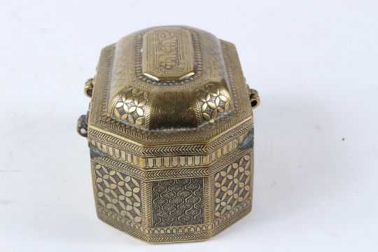 A FINELY ENGRAVED 18TH CENTURY MUGHAL INDIAN BRASS PANDAN BOX.