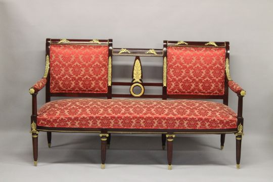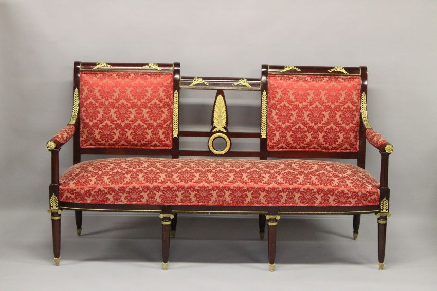 A FRENCH EMPIRE REVIVAL MAHOGANY FRAMED SALON SUITE, comprising of a double chair back settee, pair of armchairs and four side chairs, all with decorative ormolu mounts, and upholstered with a classical red ground material.