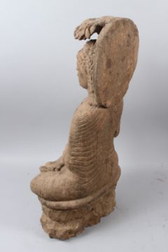 A LARGE, POSSIBLY EARLY INDIAN, CARVED STONE BUDDHA.