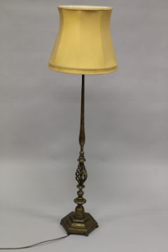 A BRASS FLOOR STANDING LAMP, with turned column on an hexagonal shape base, with shade.