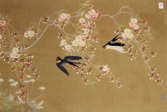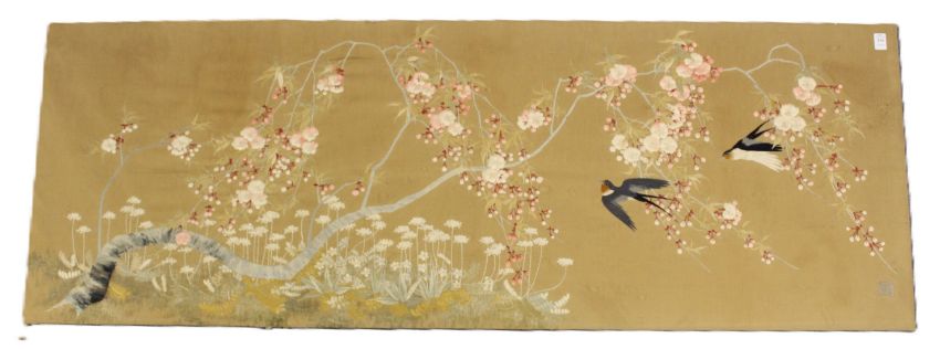 A LARGE JAPANESE EMBROIDERED PICTURE, depicting a pair of swallows flying amongst cherry blossom, signed, mounted but unframed.